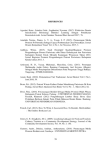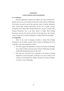 This final report is aimed to design an e-booklet of Tepian Musi Floating Restaurants to promote tourism culinary in Palembang. The purpose of this final report is to design e-booklet Tepian Musi Floating Restaurants as one of media to promote culinary tourism in Palembang. The problem is how to design e-booklet of Tepian Musi Floating Restaurants as one of media to promote tourism culinary in Palembang. In this final report, the writer used research and development method by Sukamadinata (2012). The writer collected the data by using literature review and field survey. The e-booklet was designed by the writer and then given to experts. The result shows the e-booklet can be used as one of media to promote tourism culinary in Palembang. The writer expects, the students of English department can be more creative and innovative in presenting tourisms as well as sharpen the writing skill.