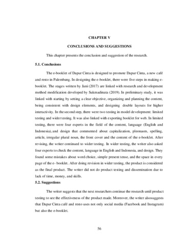 This final report is aimed to design an e-booklet to promote Dapur Cinta. The purpose of this final report is to explain how to design an e-booklet to promote Dapur Cinta. This study is hoped to provide new information and knowledge about Dapur Cinta. The problem is how to design e-booklet to promote Dapur Cinta. In this final report, the writer used research and development by simplifying Sukmadinata’s (2019) research and development method. For making e-booklet, the writer used steps in making e-booklet from Jani (2017). The e-booklet was designed by the writer and then it was given to the experts. After having revision from the experts, e-booklet was considered as final report. This final report has explained the steps in designing an e-booklet to promote Dapur Cinta. This e-booklet entitled “Dapur Cinta” consists of 19 pages in Indonesian and English. The result shows the e-booklet can be used as medium to promote Dapur Cinta. The writer suggests to the next researchers continue the research until product testing to see the effectiveness of the product made.