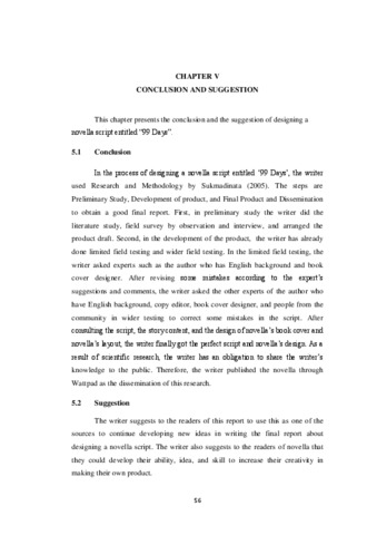 This final report is aimed to design a novella script entitled “99 Days”. The purpose of this research is to find out the steps in designing a novella script entitled “99 Days”. In this final report, the writer used the Research and Development Method modified from Sukmadinata (2005). The writer collected the data by observation and interview as a reference for designing a novella script and to get information. The novella script was designed by the writer and then given to experts. The result of this research is that the writer made a novella entitled “99 Days”. The writer expects the readers of this report to use this as one of the sources to continue developing new ideas in writing the final report about designing a novella script. Then, to the readers of novella that could develop their skill to increase the creativity in making their own product.