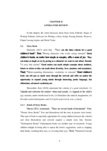 This report discussed about designing storybook of Puyang Kemiri the origin of Empat Lawang folktale. The aim of this final report is to apply the steps for writing a folktale in terms of script. In this final report, the writer used Research and Development modified by Sukmadinata (2008: 176). The “Research and Development” includes 3 steps : (1) Preliminary Study: Literature Study, Field Survey which contains of interview, observation, and documentation, and Model Drafting, (2) Model Development consisted of Limited Testing and Wider Testing, and also (3) Final Product Testing. Based on the finding, the writer makes a story script of Puyang Kemiri folktale. The story script was written in English by using Final Draft as the software of writing the story. The story of Puyang Kemiri could be used as one of the media for the preservation of the origin Empat Lawang. In conclusion, the writer conducted the story script writing by using R&D method by Sukmadinata (2008: 176) linked to the five stage of writing a folktale by Tompkins (2010: 52): Pre-writing, Drafting, Revising, Editing, and Publishing. Due to lack of time, cost, and energy, the writer stopped the project until editing stage.