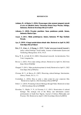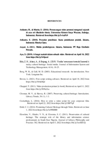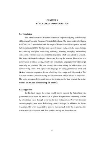 Introducing Kampung pengrajin Anyaman Nipah is crucial since it is the only village in Palembang that preserve local culture through Nipah woven crafts. In this research, the writer has chosen video as media promotion. Script is one of the essential element of a video. Therefore, this final report was aimed at finding out how to design a video script of Kampung Pengrajin Anyaman Nipah in Palembang. In this final report, the writer used research and development (R&D) modification by Sukmadinata (2017) which consisted of preliminary study, model development, and final testing. These stages were related with the stages of writing video script by Ranga and Koul (2017). In preliminary study, the steps were to find idea, set brief plan, and research to make the first draft of the product. The next step was model development which divided into two testings, limited testing and wider testing. The testings involved seven experts to review the content, language, format of the video script, and video design. The last step was final testing, in which the result was a video script of Kampung Pengrajin Anyaman Nipah and a video entitled “Visiting Kampung Pengrajin Anyaman Nipah to Learn and Preserve Nipah Woven Crafts as Cultural Heritage in Palembang”. The writer disseminate the product through YouTube as it is the most famous social media platform with 88% access by Internet users aged 16 to 64 in Indonesia. It can be concluded that there are three steps during the research, preliminary study to arrange the draft, developing the model through testing, and finishing the final product.