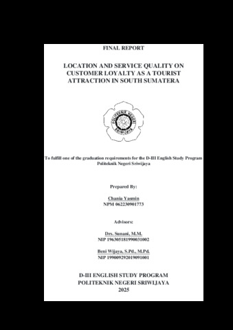 Yasmin, Chania (2025) LOCATION AND SERVICE QUALITY ON CUSTOMER LOYALTY AS A TOURIST ATTRACTION IN SOUTH SUMATERA. Diploma thesis, Politeknik Negeri Sriwijaya.