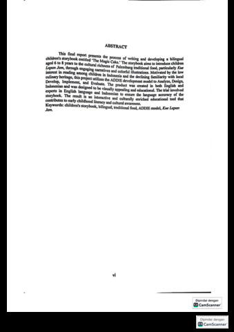 This final report presents the process of writing and developing a bilingual children's storybook entitled ‘The Magic Cake.’ The storybook aims to introduce children aged 6 to 8 years to the cultural richness of Palembang traditional food, particularly Kue Lapan Jam, through engaging narratives and colorful illustrations. Motivated by the low interest in reading among children in Indonesia and the declining familiarity with local culinary heritage, this project utilizes the ADDIE development model to Analyze, Design, Develop, Implement, and Evaluate. The product was created in both English and Indonesian and was designed to be visually appealing and educational. The trial involved experts in English language and Indonesian to ensure the language accuracy of the storybook. The result is an interactive and culturally enriched educational tool that contributes to early childhood literacy and cultural awareness.