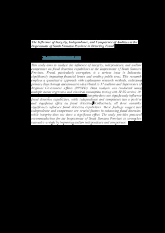 Fharadhiba, - (2025) PENGARUH INTEGRITAS, INDEPENDENSI DAN KOMPETENSI AUDITOR INSPEKTORAT PROVINSI SUMATERA SELATAN DALAM MENDETEKSI FRAUD. Diploma thesis, Politeknik Negeri Sriwijaya.