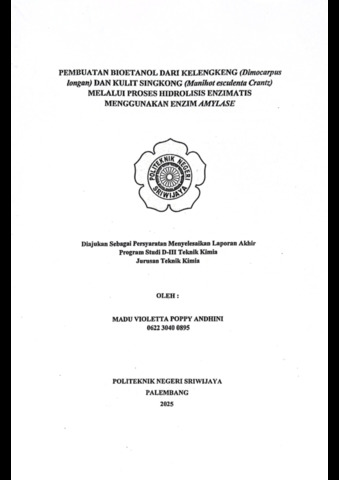 Andhini, Madu Violetta Poppy (2025) Pembuatan Bioetanol dari Kelengkeng (Dimocarpus longan) dan Kulit Singkong (Manihot esculenta Crantz) Melalui Proses Hidrolisis Enzimatis Menggunakan Enzim Amylase. Diploma thesis, Politeknik Negeri Sriwijaya.