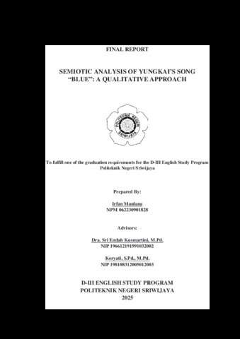 Maulana, Irfan (2025) SEMIOTIC ANALYSIS OF YUNGKAI’S SONG “BLUE”: A QUALITATIVE APPROACH. Diploma thesis, Politeknik Negeri Sriwijaya.