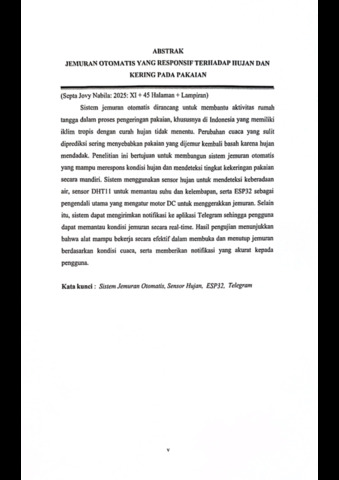 | Uncontrolled Keywords: | Sistem Jemuran Otomatis, Sensor Hujan, ESP32, Telegram |