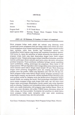 Gustiyar, Putra Tara (2026) RANCANG BANGUN MESIN PENGUPAS KELAPA MUDA (PROSES PEMBUATAN). Diploma thesis, Politeknik Negeri Sriwijaya.