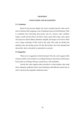This report discussed about how to design the product which is the script and video that contains of the information about making Kue LumpangusingBunga Telang as natural dye. The purpose of this final report is to apply the steps of design video script of Kue Lumpang using Bunga Telang as Natural Dye and to give information about Kue Lumpang. In this final report, the writer used Research and Development modified by Sukmadinata (2008: 184-191). The “Research and Development” includes 3 steps : (1) ) Preliminary Study, (2) Model Development, and also (3) Final Product Testing. Moreover, the writer found that YouTube is a good way for people to share the video to give information for public. In developing the script and video, the criticism and suggestions provided by experts were valuable.
