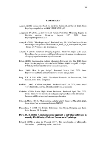 (Arga Rizki Putri, 2020: 31 pages) This final report discusses about the designing a storybook of Putri Jelitani to preserve the cultures of Ogan Komering Ilir Region. The purpose of this research is to find out the steps in designing a story book entitled Putri Jeliani in order to preserve the story as one of cultures from Ogan Komering Ilir. The writer used Research and Development method modified from Sukmadinata (2008) consist of: (1) Preliminary Study; (2) Model Development; and (3) Final Testing. The modification was conducted due to the limitation of fund and time. This report using purposive sampling, there were two experts in limited testing and five participants in wider testing participated in this research. The results revealed that the revisions were focused on font, background of the text and cover. It was suggested to add more illustrations in the story book to have more imagination of the real situation. The data and framework were prepared in designing the storybook. Therefore, the data were collected from the interviews. The writer prepared some questions about good storybook quality. The design was created by the writer and supported by some expert’s suggestion to be printed as the final product.